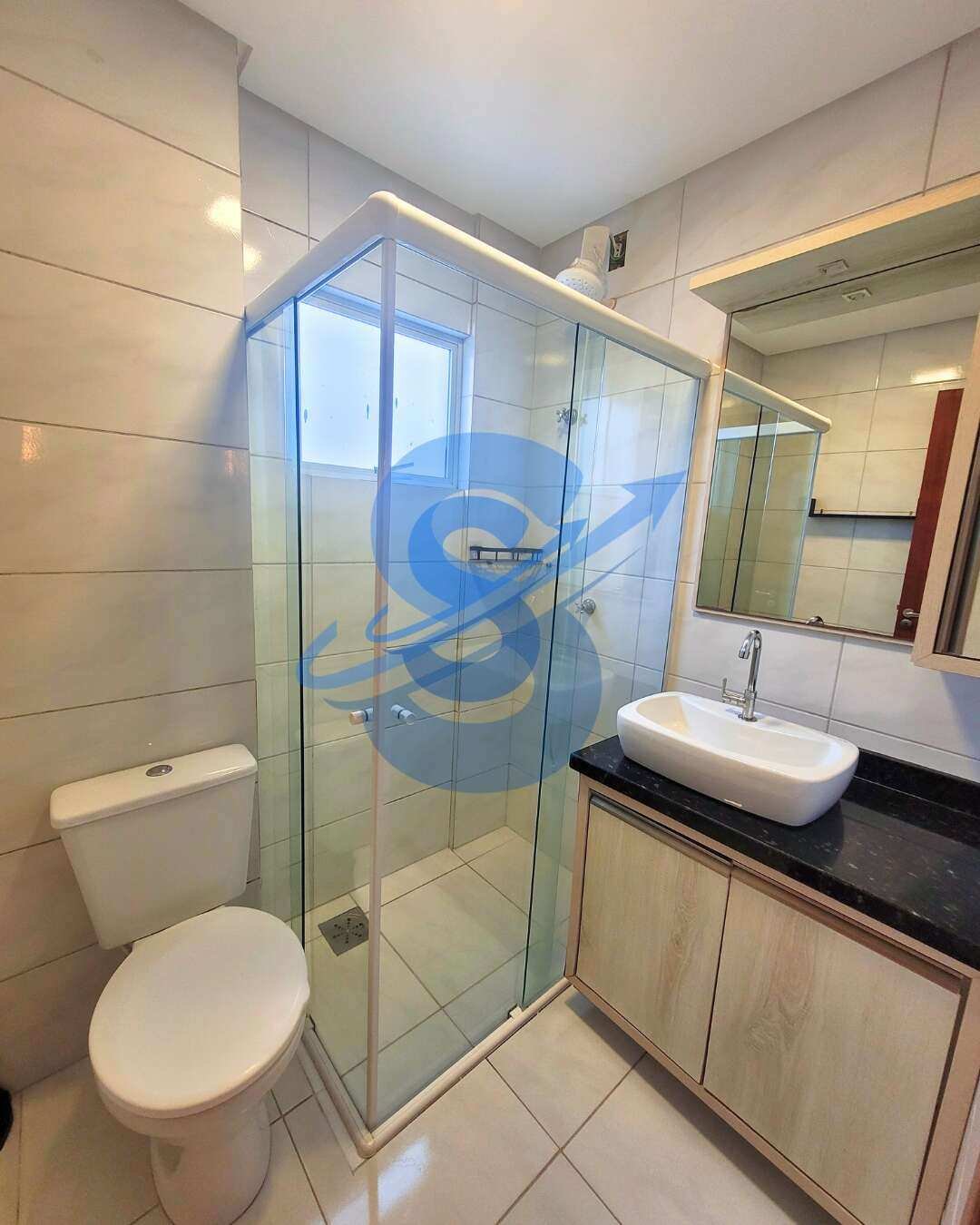 Dois banheiros modernos com móveis planejados, bancada em granito, espelhos e box em vidro temperado.