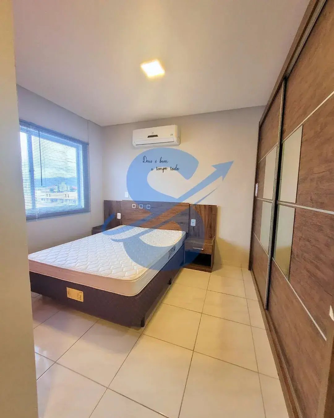 Dormitório principal com cama box de casal, cabeceira planejada com criados-mudos embutidos, ar-condicionado split e guarda-roupa espelhado.