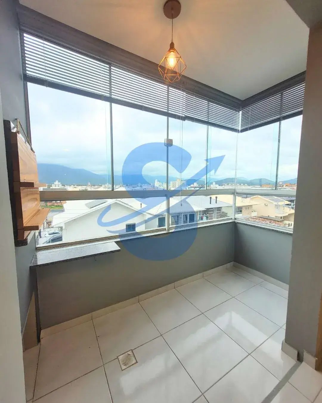 Sacada gourmet fechada com vidro, churrasqueira e vista panorâmica.